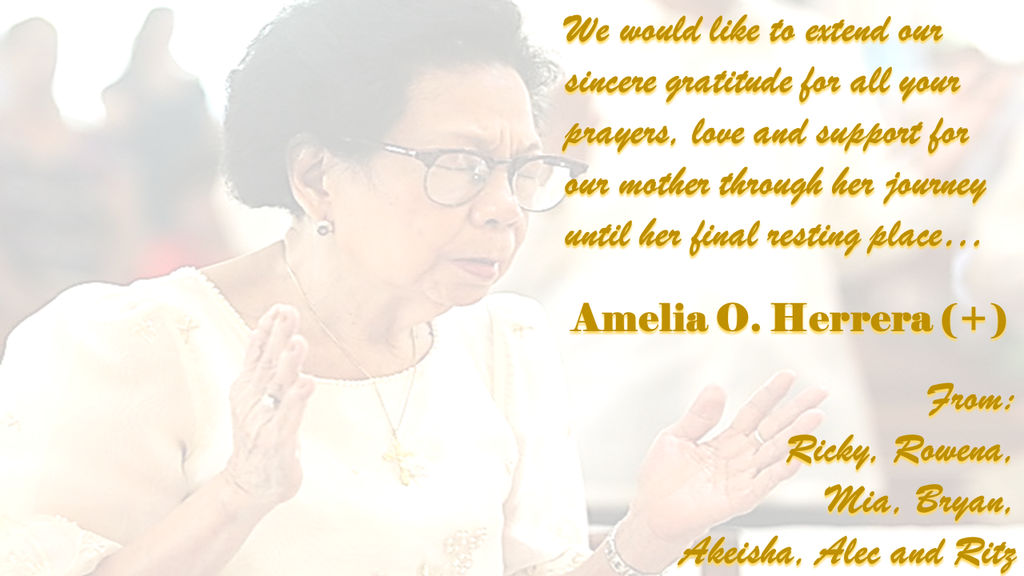 Maraming salamat sa inyo na kahit tayo ay nasa pandemic ay nakapagpaalam tayo mabuti kay mommy. Tinanong nga ako ng anak ko, ilan ang nagmamahal kay lola? Sabi ko, just look at the likes and the comments in her online wake. Sabi niya, “Wow! That is how many people who loves lola?” Kaya taos puso po kaming nagpapasalamat sa inyong lahat sa inyong mga tulong at dasal. Sa inyong lahat na nagmamahal at nagpaalam kay Mommy Amy.